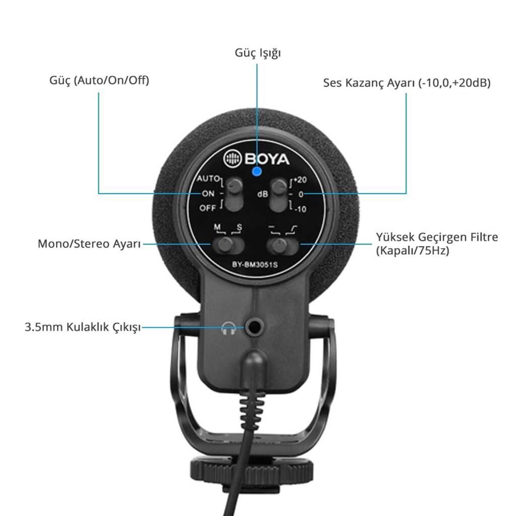 Boya BY-BM3051S, DSLR fotoğraf makineleri, video kameralar, ses kaydediciler için tasarlanmış Stereo/Mono değiştirilebilir kondenser shotgun mikrofondur.