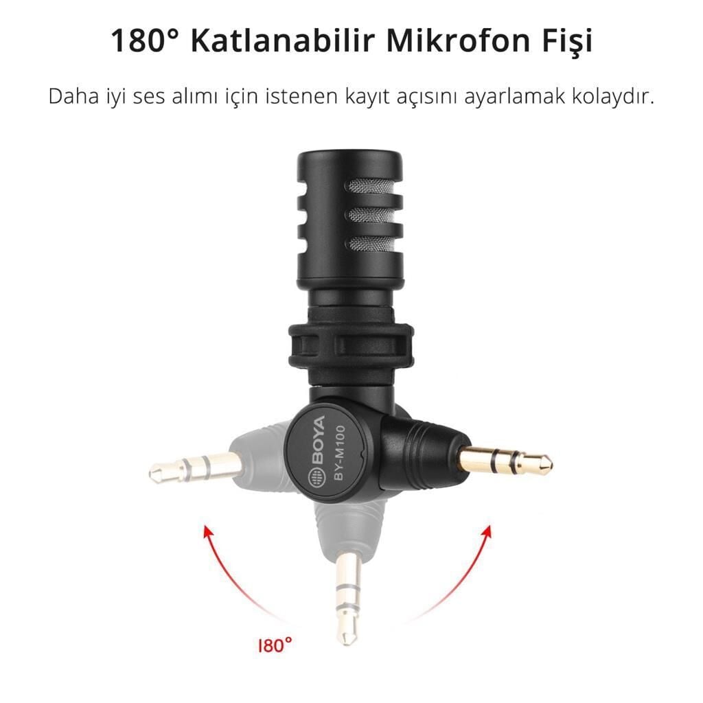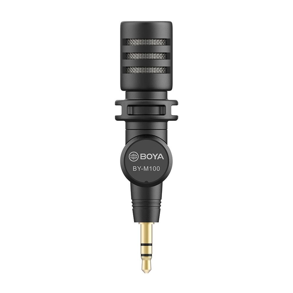 Boya BY-M100, DSLR fotoğraf makinesi, video kamera, ses kayıt cihazı gibi cihazlar için minyatür boyutta, çok yönlü 3.5mm TRS mikrofondur.
