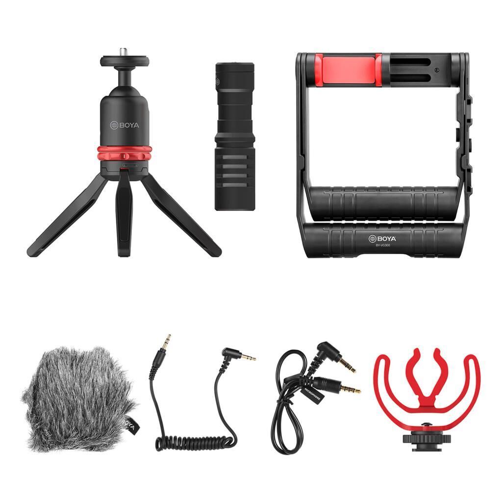 Kutu İçeriği: BY-VG300 telefon rig, BY-MM1 mikrofon, Shock mount, Mikrofon tüyü, TRS ara kablo, TRRS ara kablo, Top kafa mini tripod