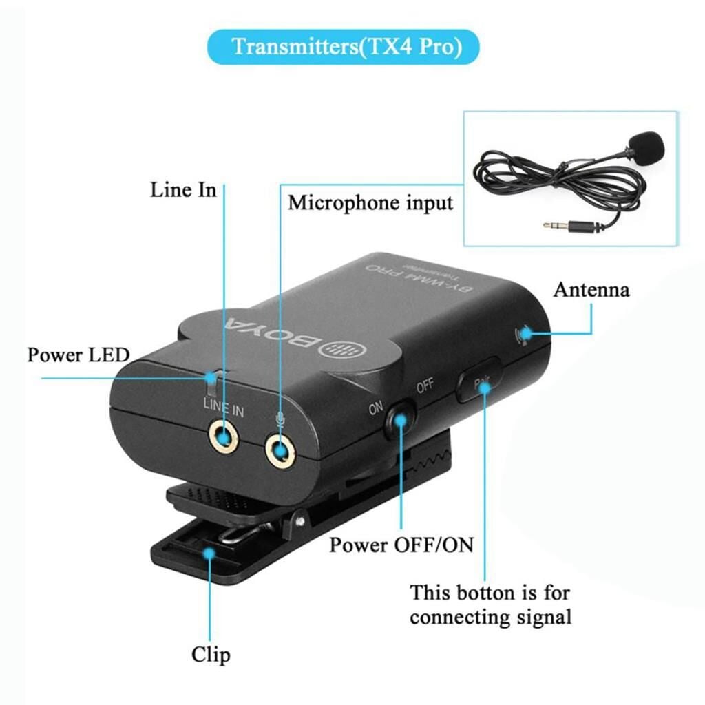 Uyumluluk: Ürün sadece Boya BY-WM4 Pro K1, Boya BY-WM4 Pro K2, Boya BY-WM4 Pro K3, Boya BY-WM4 Pro K4, Boya BY-WM4 Pro K5, Boya BY-WM4 Pro K6 mikrofonların alıcılarıyla uyumludur. (BY-WM4 ve BY-WM4 Mark II alıcılarıyla ile uyumlu değildir)