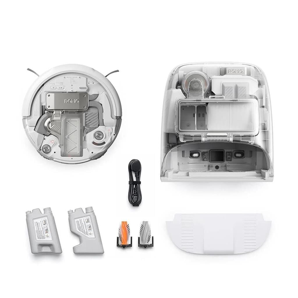 Temizlik solüsyonu, zemin kokusu, yüksek sıcaklıkta paspas yıkama, yüksek sıcaklıkta toz haznesi kurutma ve robot toz haznesi filtresiyle ROMO P son derece kapsamlı bir temizlik sunar.