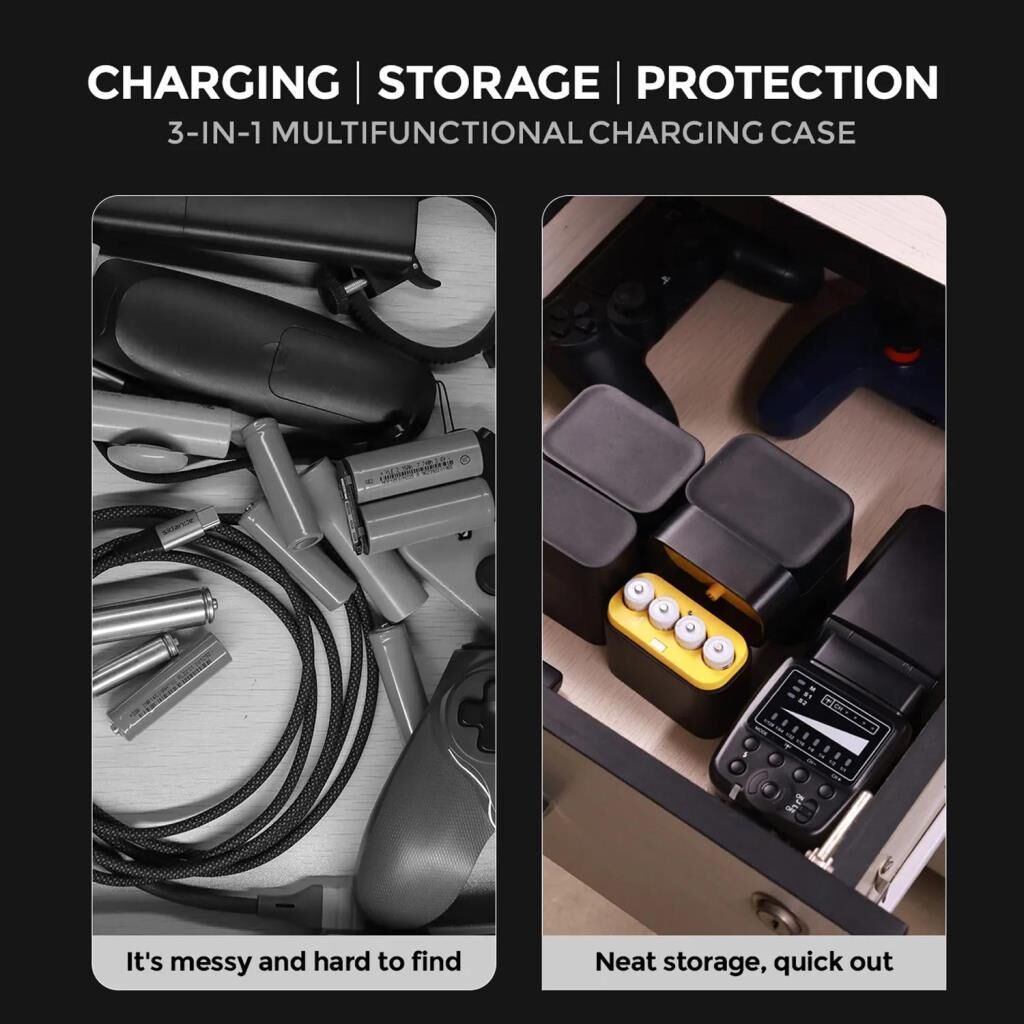 - 3’ü bir arada koruma & depolama: Şarj kutusu, manyetik kapanma mekanizmasına ve bağımsız yuvalara sahiptir. Bu tasarım, hem hızlı şarj hem de düzenli saklama işlevi görür. Kutu, nem, toz, basınç ve sıçramalara karşı pilleri korur ve taşımayı kolaylaştırır.