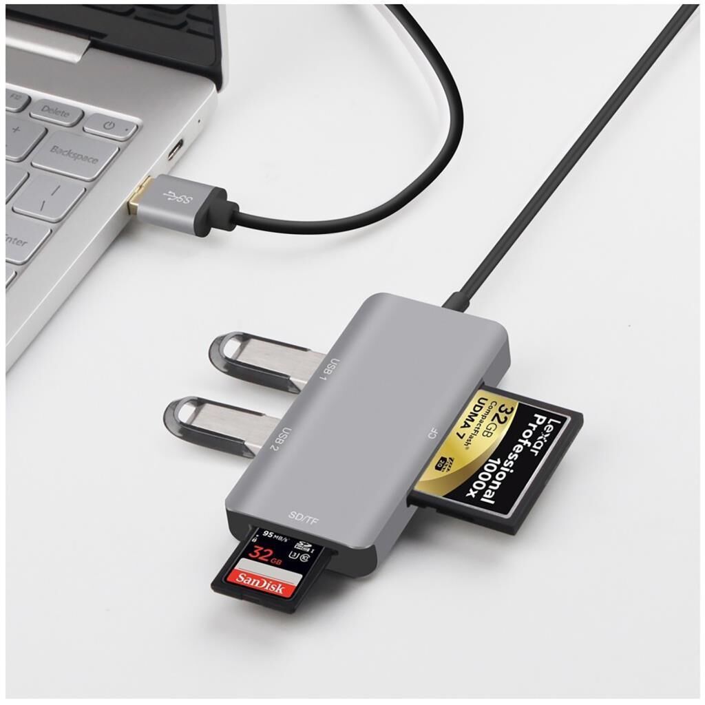 - Hub aynı zamanda CF, SD, TF (Micro SD) kartlarının okunmasına ve yazılmasına izin veren bir hafıza kartı okuyucusudur. 512 GB'a kadar kapasiteleri destekler.