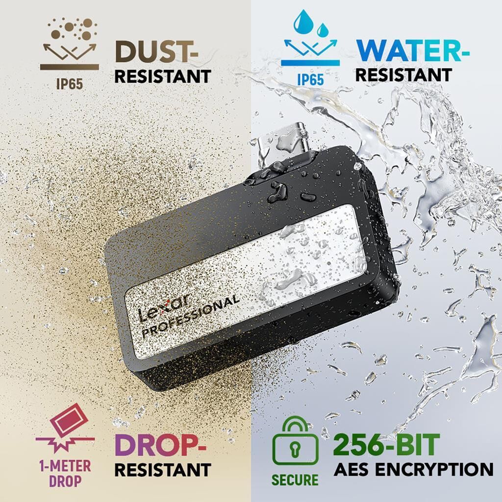 İçerik Üreticileri için En İyi Çözüm Lexar 2TB Professional Go SSD, yalnızca 2.71 x 1.71 x 0.32 inç boyutlarında ve 0.5 ons ağırlığındadır. 2TB depolama kapasitesi ile yüksek çözünürlüklü fotoğraf ve videolarınızı saklayarak yaratıcılığınıza odaklanabilirsiniz. Lexar Professional Go SSD, entegre 4 portlu USB-C hub ile ışıklar, mikrofonlar, güç bankaları ve diğer aksesuarları bağlamanızı sağlar. Kutudan çıkan USB-C adaptörler ve soğuk ayakkabı bağlantı kablosu ile maksimum esneklik sunar. iPhone 15 Pro/Pro Max ve iPhone 16 Pro/Pro Max ile tam uyumlu olan bu SSD, Apple ProRes 4K/60fps videoları doğrudan kaydetmenize ve hızlıca post-prodüksiyon işlemine geçmenize olanak tanır. IP65 sertifikalı Lexar Professional Go SSD, suya ve toza karşı dayanıklıdır. Ayrıca, 3.3 feet (1 metre) yükseklikten düşmelere karşı koruma sağlar ve silikon koruyucu kılıfıyla güvenilirlik sunar. USB 3.2 Gen 2 teknolojisi sayesinde 1050 MB/s okuma ve 1000 MB/s yazma hızlarına ulaşarak projelerinizi hızlıca yönetebilirsiniz. Hub üzerindeki USB-C portlar, 10 Gb/s veri transfer hızı desteğiyle iş akışınızı daha verimli hale getirir. Tak-çalıştır özellikleriyle kablosuz ve zahmetsiz kullanım sunar. Uzun süreli çekimlerde veya aksesuar bağlantısı gerektiğinde hub ile birlikte kullanabilirsiniz.Lexar 2TB Professional Go USB 3.2 Gen 2 Taşınabilir SSD ve USB-C Hub