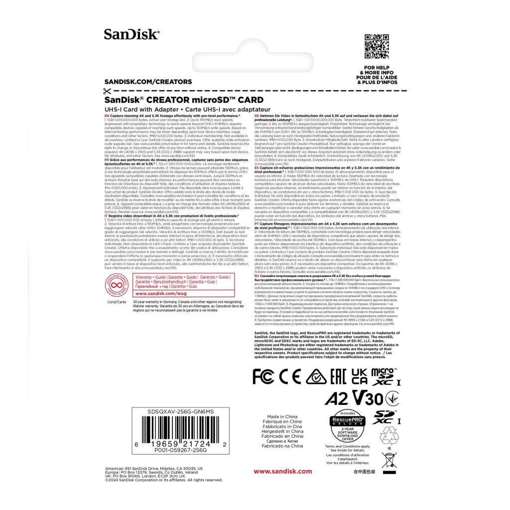 SanDisk Creator 256GB 190/130MB/s UHS-I U3 A2 V30 Micro SD Hafıza Kartı - SDSQXAV-256G-IN6M