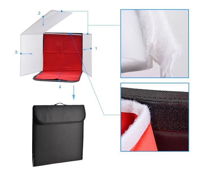 Paket İçeriği: 1 Ad. Ürün çadırı ile Beyaz, Mavi, Siyah ve Kırmızı olmak üzere 4 adet çekim fonu