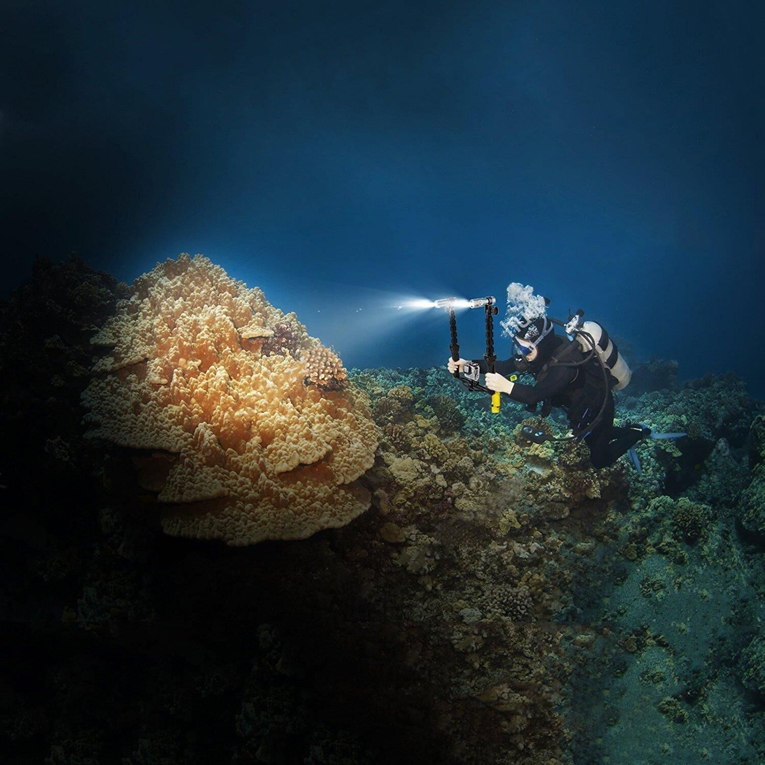 Ürün aksiyon kameranız ile su altında düşük ışıkta çekim yapmanızı sağlayan profeyonel suya dayanıklı ışıktır. 1.5m yüksekliklerden düşmelerde darbelere karşı dayanıklı, korozyona ve paslanmaya karşı dayanıklıdır. Uyumlu dönüştürücüler kullanılarak sualtı fotoğraf makinaları ve kameralar ile de kullanılabilir. 900lm, 300lm, çakar ışık ve lazer olmak üzere 4 modda yanabilme özelliğine sahiptir.
