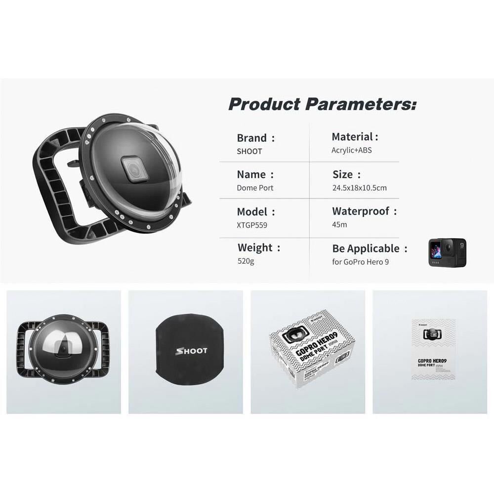 Gopro Hero 9 Aksiyon Kamerası için Shoot tarafından üretilmiş su altı dome porttur. Kubbe yapısı sayesinde aynı anda hem suyun üzerini hemde altını çekecek şekilde tasarlanmıştır. Ön camı lens yansımalarını azaltacak materyaller ile özel olarak üretilmiştir. 180° Süper geniş açıya sahiptir. 45 Metreye kadar su geçirmeme özelliğine sahiptir.