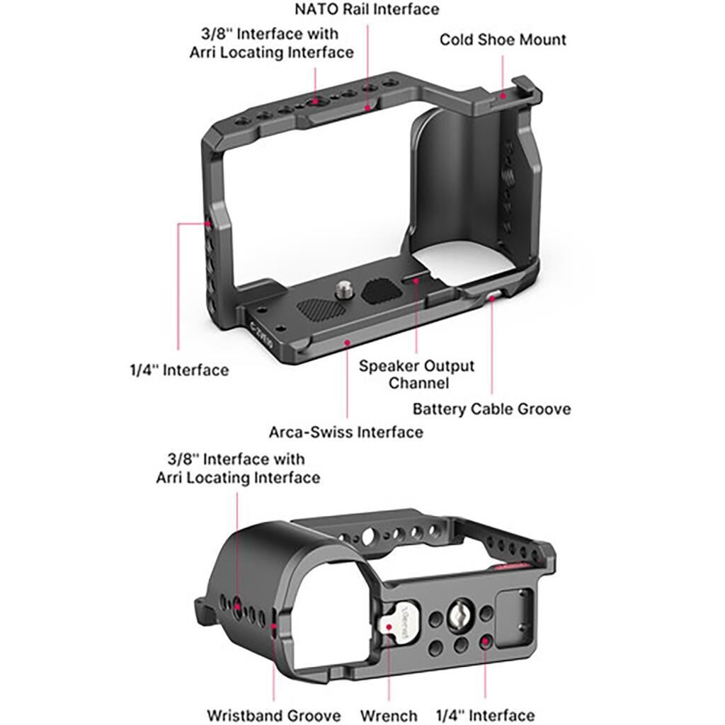 Kafes, birden fazla 1/4" ve 3/8" vida içerir ve ışık, mikrofon v.b. ürünleri monte edebilmek için üstte ve altta yuvaları vardır. Kafesin altı, tripod montajı için birden fazla 1/4" dişi vida ile doludur. Yanlarda ayrıca mevcut, bilek veya boyun askısı takabilmeniz için kayış yuvaları vardır.