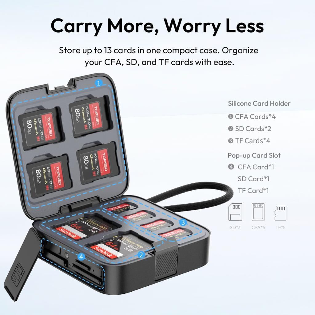 Daha Fazla Taşı, Daha Az EndişelenBir kompakt kılıfta 13 karta kadar depolama imkanı sunar. CFA, SD ve TF kartlarınızı kolayca organize edin. |