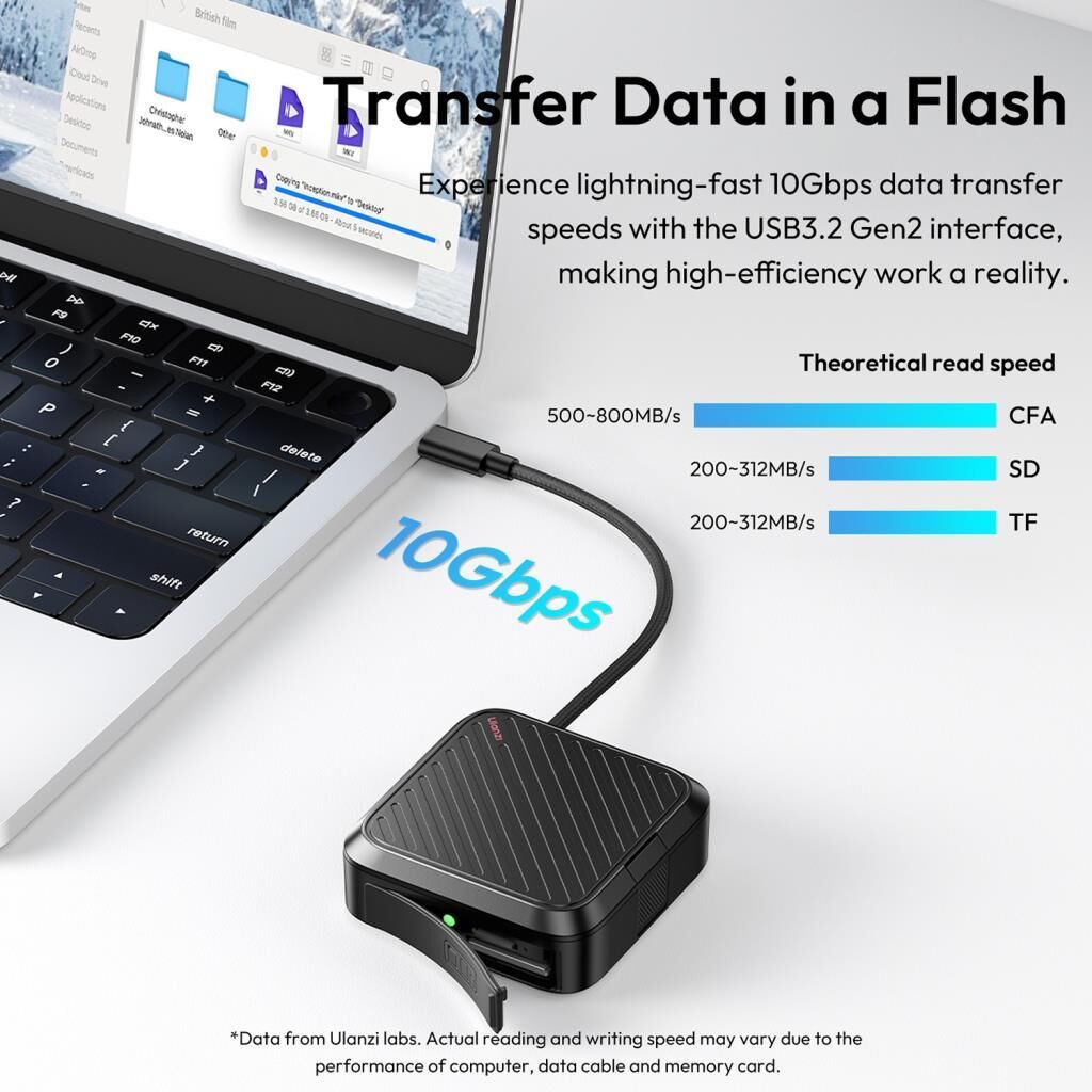 Veri Aktarımını Hızla GerçekleştirUSB 3.2 Gen 2 arayüzü ile 10 Gbps hızında veri transferi deneyimi yaşayın, yüksek verimli çalışmayı gerçeğe dönüştürün.*Ulanzi laboratuvarlarından alınan veriler. Gerçek okuma ve yazma hızı, bilgisayar, veri kablosu ve bellek kartının performansına bağlı olarak değişebilir. |