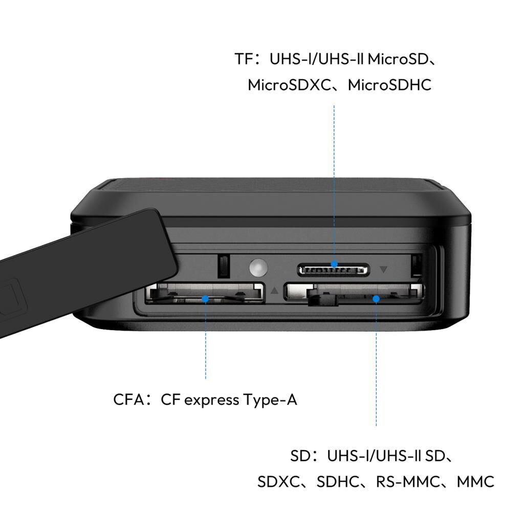 Ulanzi CRC10 3-in-1 Kart Okuyucu Kılıfı, CFexpress Type A, SD ve microSD kartları için hem depolama hem de okuma işlevi sunar. Entegre 10 Gbps USB 3.2 Gen 2 arayüzü sayesinde hızlı veri transferi sağlar. Alüminyum alaşım dış yüzeyi, etkin ısı dağılımı sunar.Öne Çıkan Özellikler: