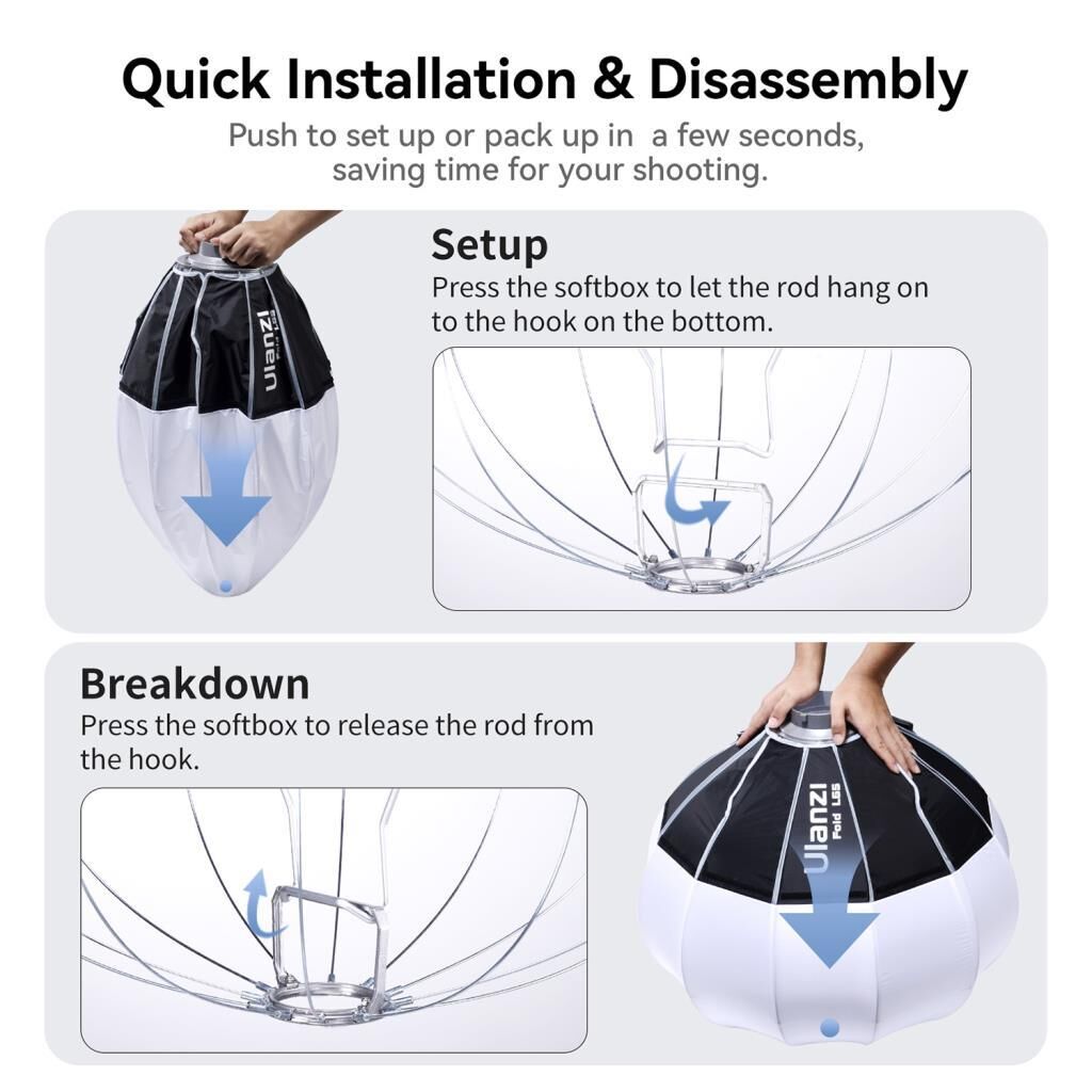 - Lantern Tasarımı: Yuvarlak tasarımı ile yumuşak, yayılmış ve homojen ışık sağlar, bu da portreler ve stüdyo çekimleri için mükemmeldir.