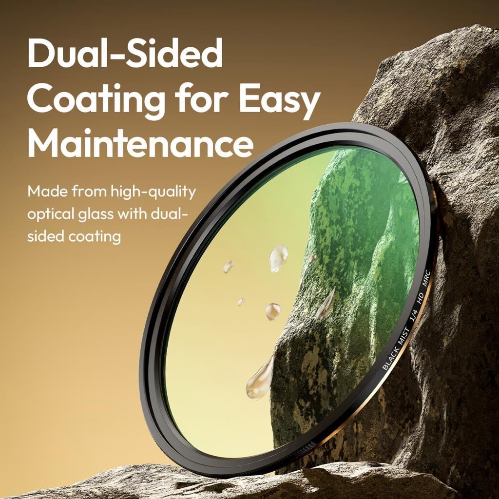 Optik cam kullanılarak üretilen filtre, çift taraflı kaplama ile korunur. Bu kaplama, yağ ve suya karşı dayanıklıdır ve temizliği oldukça kolaydır. Hem yağlı parmak izlerinden hem de su lekelerinden korunarak, uzun süre net ve keskin görüntüler elde etmenizi sağlar. -