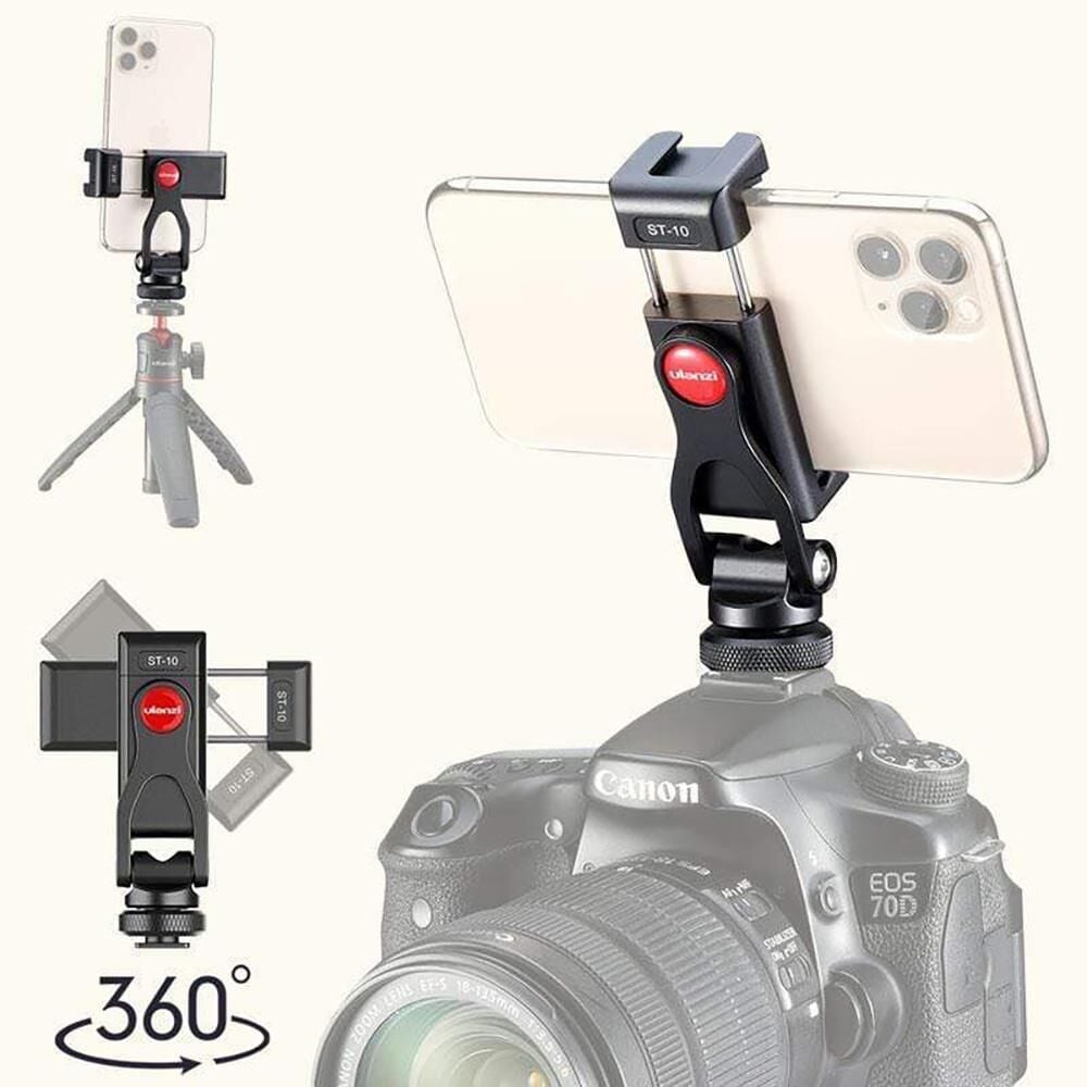 Ulanzi ST-10 akıllı telefon standı, cep telefonlarınızı çeşitli aksesuarlar ile kullanmanıza olanak tanıyan metal alaşımdan üretilmiş bir telefon standıdır. DSLR fotoğraf makineize veya video kameranıza cold shoe bağlantısı ile takılabilmesinin yanı sıra çeşitli cold shoe yuvalarına da uyum sağlayabilmektedir. 1/4" inç vida girişine de sahip olan standın telefon tutma kısmı dönmektedir ve bu sayede dikey çekim işlevini de kullanıcısına sunmaktadır. Telefon tutma kısmının iki tarafında da cold shoe yuvası bulunmaktadır. Led ışık, mikrofon ve benzer aksesuarları taşıyabilen ST-10 stand 56-80mm genişliğinde telefonlar için uygundur. Başlık kısmı tilt hareketini sağlayabilmekte ve farklı açılar kolayca ayarlanabilmektedir.