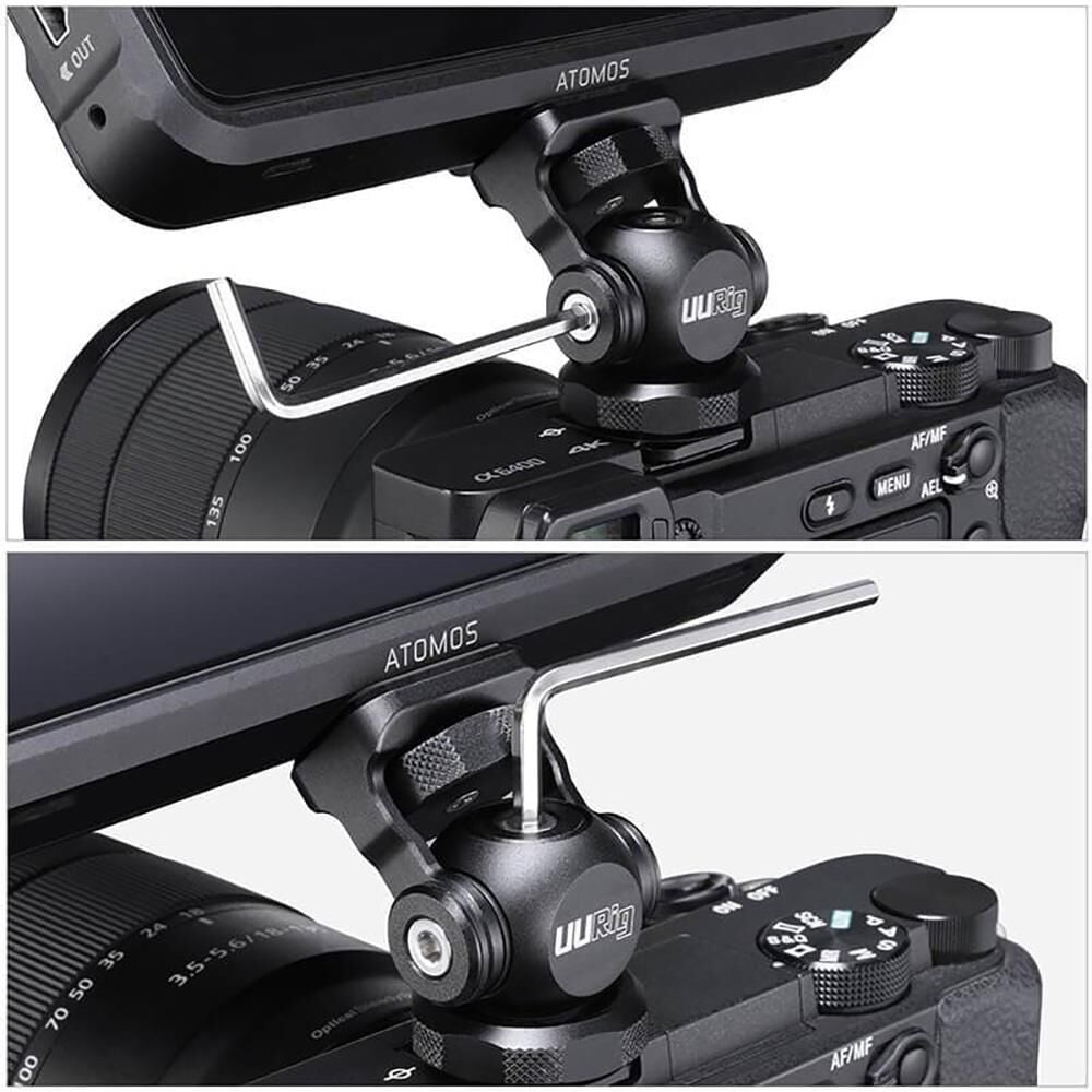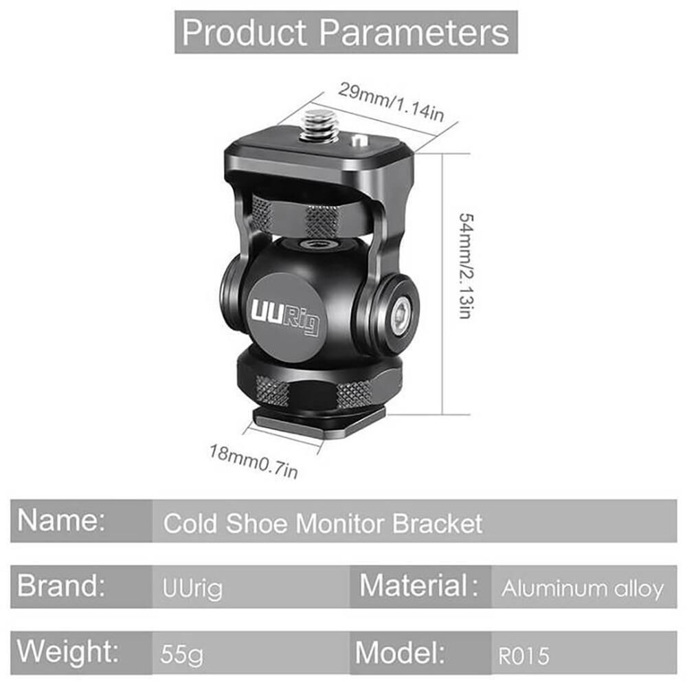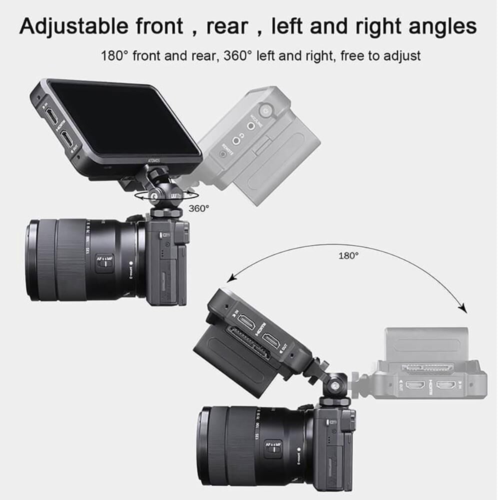 Doğrudan kamera flash yuvasına sabitlenen bu monitör braketi, alüminyum alaşımından yapılmıştır 180° ön ve arkaya yatabilir, 360° kendi etrafında dönüş yapabilir.
