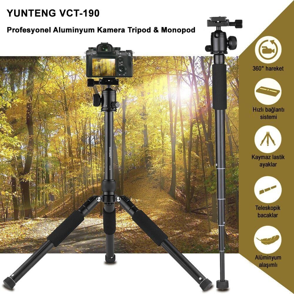 Yunteng VCT-190 Kompakt tripod terse katlanabilir ve oldukça küçülebilen kompakt bir tripoddur. Metal alaşım malzemesi ile oldukça sağlam olan tripod farklı bacak açıklıkları ve ayarlanabilir kademesiyle dslr ve aynasız fotoğraf makineniz, telefonunuz, aksiyon kameranız ve video kameranızda kullanabileceğiniz nadir özelliklere sahip bir tripod olarak sunulmaktadır. 138cm açık uzunluğu ve 1.12 kilogram ağırlığı ile kompakt bir tripoddan tüm beklentinizi karşılayabilecek yapısı ile en iyi çekimleri yapmanıza olanak tanır.