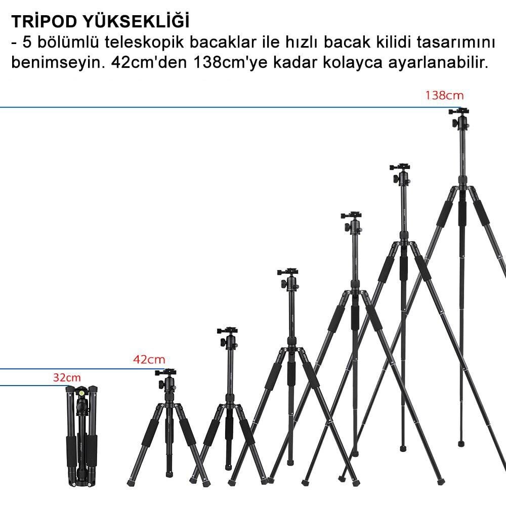 - 5 bölümlü teleskopik hızlı kitlenebilen bacaklar. 42cm'den 138cm'ye kadar kolayca ayarlanabilir.